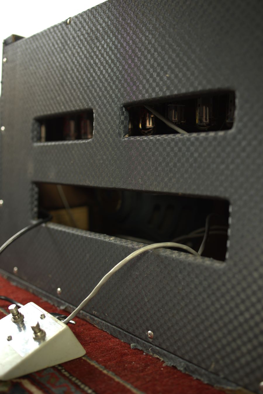 The Ampeg Super Echo Twin is one of only three very stereo amp designs produced in the sixties. The Echo Twin has two complete amps in the same cabinet and has options on how to share the tremolo and the reverb between them (basically wet-wet or wet-dry). The tremolo & reverb are lush, quite unlike the Fender equivalents, and the resulting spacial effects are nothing short of unworldly. The Tolex and other cosmetics have seen a bit of use commensurate with its age. I have had to change both failed output transformers with new replacements from Flip Top. All other major components, PTs, speakers, etc, are original, and I've replaced a couple of failing resistors and valves to restore it to full health.