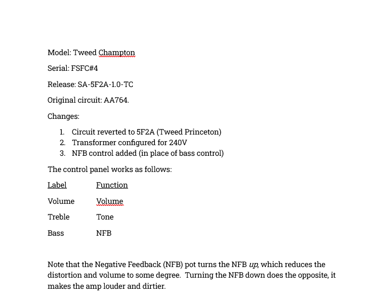 This is a Tweed Princeton circuit in a Silverface Champ body and it sounds phenomenal. To be clear, it is actually the exact Tweed Princeton 5F2A circuit, not just similar, it is the same. The only significant addition we've made to the original circuit is to re-wire the now redundant bass pot as an NFB control. Now you can decide how gritty you want it to be. The volume & tone control are as per the Princeton. The speaker is an amazing Warehouse alnico, unbeatable tone. You're getting a classic tweed circuit for a fraction of the price of a real one. Very cool sounding amp, and a lot louder than you would expect! Runs on UK voltage.