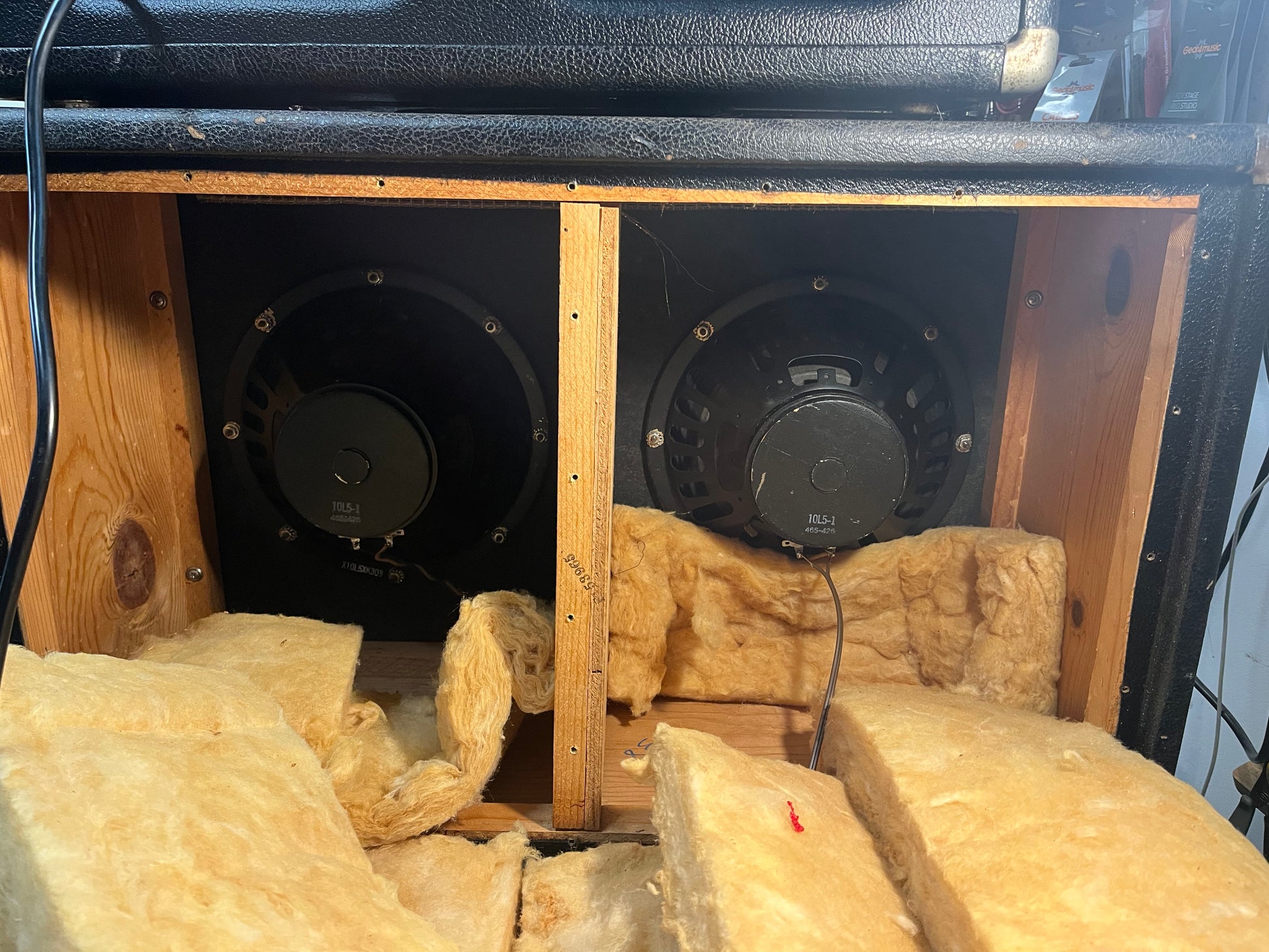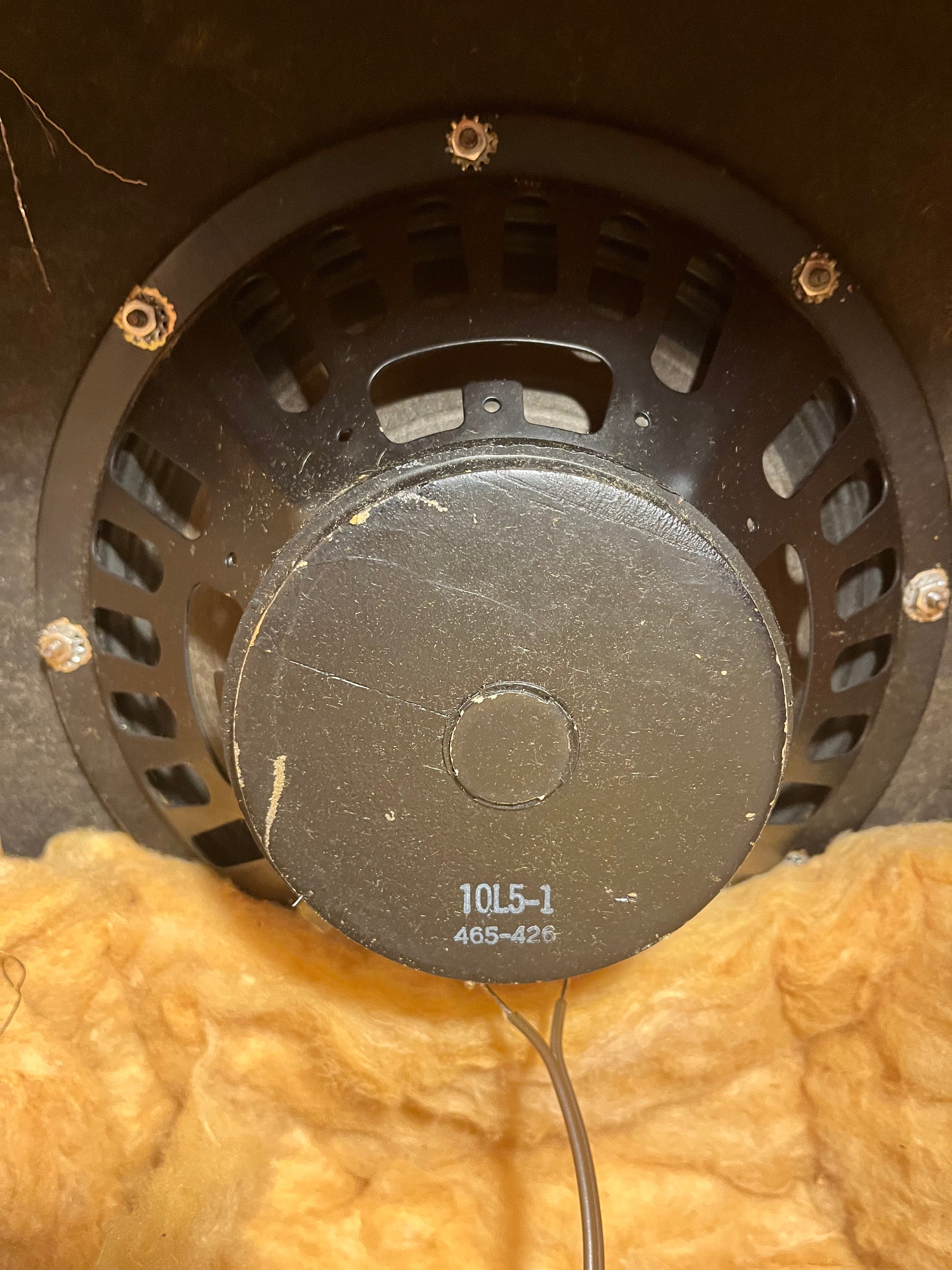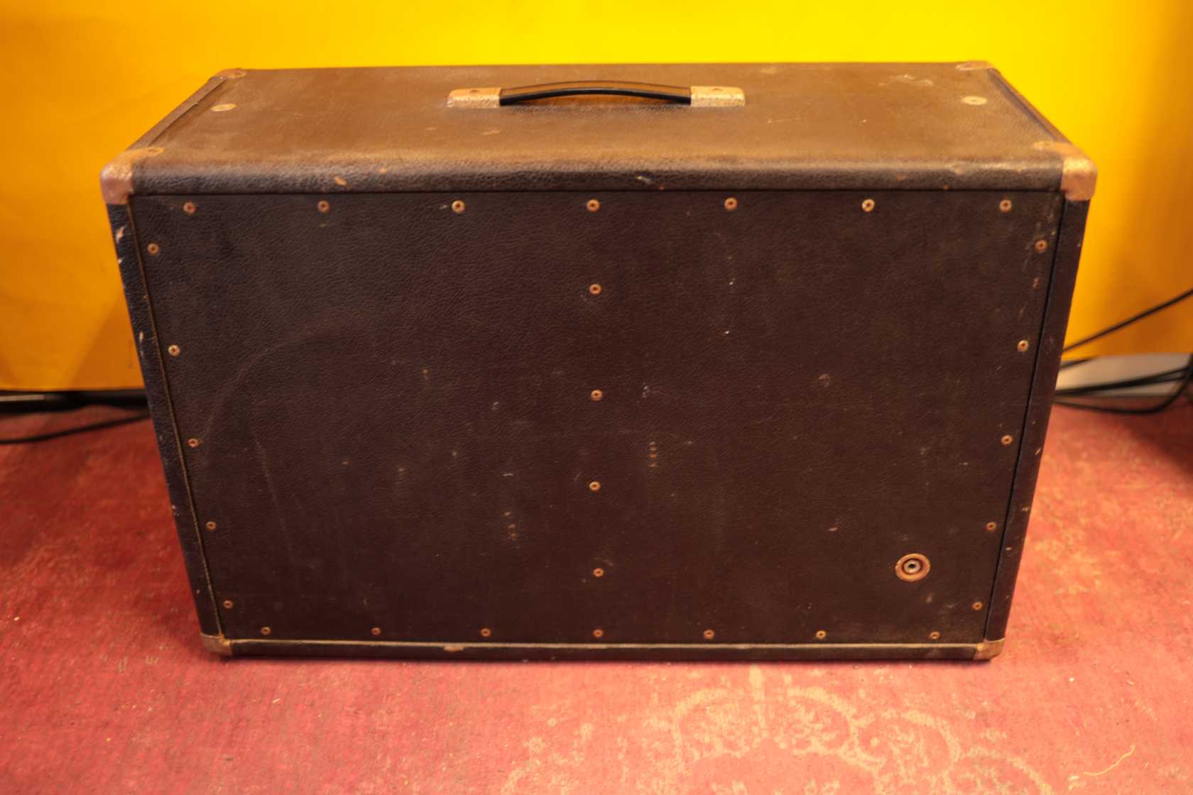 Very nice mid '64 2x10" Tremolux cab with the original Oxford 10L5 speakers. Significantly smaller and lighter than the standard 2 x12" cabs, this cab sounds fantastic. This pair of speakers has a combined power rating of about 30W RMS, which is fine for what it was built for but if you want to strap your JCM1000 on you might want to change the speakers for some modern ones with a greater power handling capacity, first. Combined impedance is 4 ohms.