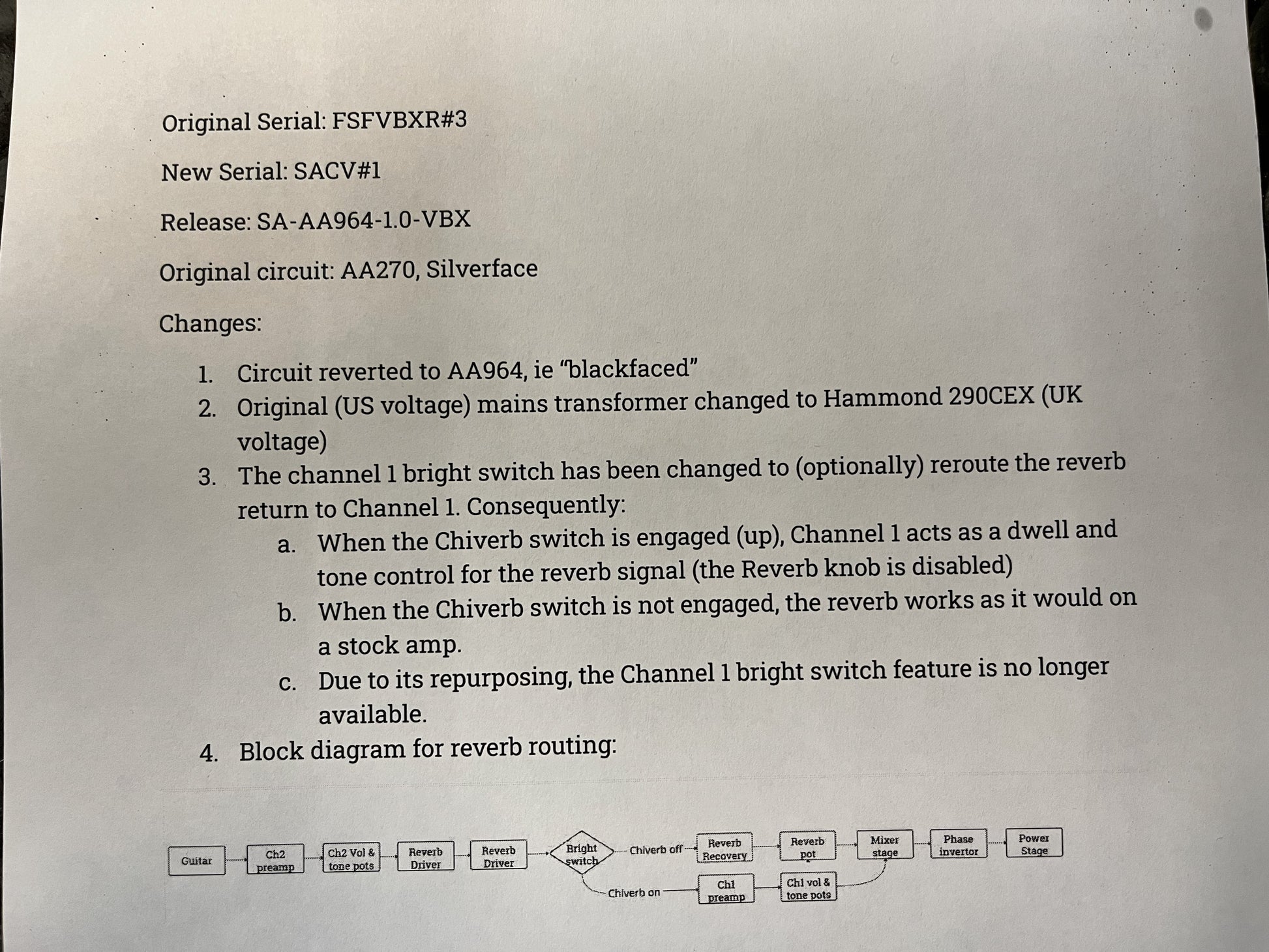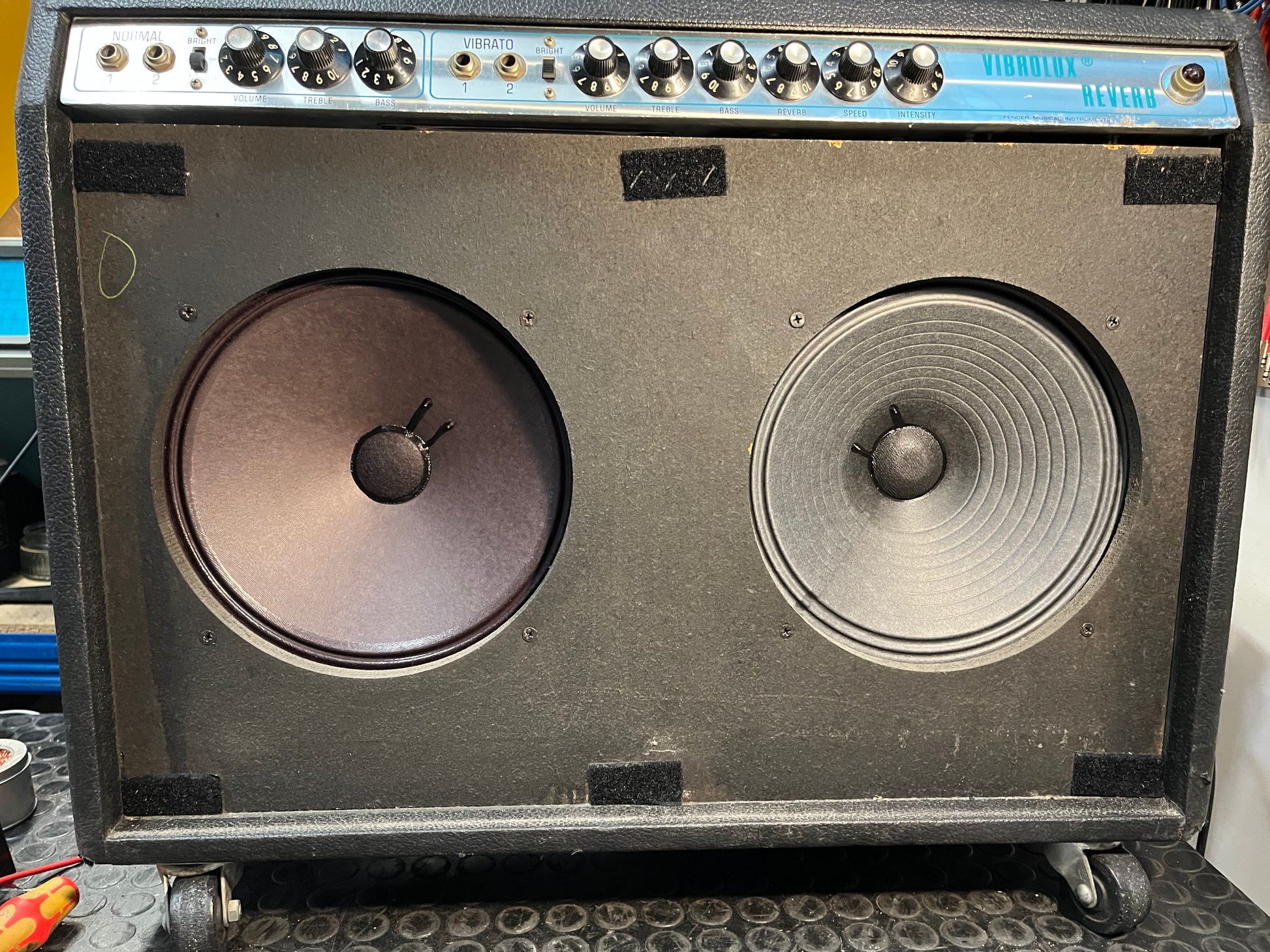 There's a lot going on with this Vibrolux. Firstly, we blackfaced it so it would sound as good as possible. Then we installed Hammond mains transformer so it would run on 240V. Then,we changed the bright switch to reroute the reverb to Channel 1, so Channel 1 would double as dwell and tone controls for the reverb signal. It doesn't sound much but if you like reverb you could well love this. We do. This aside the amp's pretty darned original, although we did have to change out the original speakers because they weren't cutting it. Has to be heard.